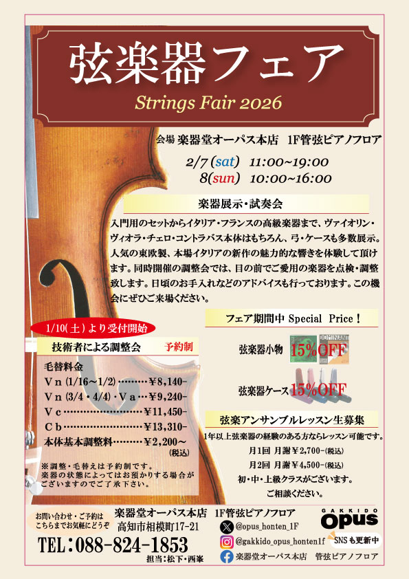 ホーム > お知らせ・イベント情報 > 弦楽器フェア(2月7日〜8日)-OPUS本店1F管弦ピアノフロア